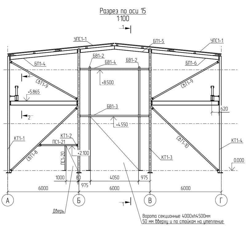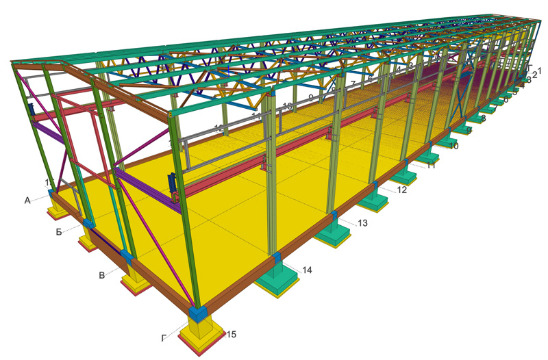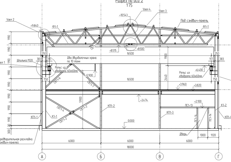 №250307 18х83х8.5м (Ш-Д-В) 1588м2. Два двухбалочных крана по 10т. Металл по КМ- 106948кг, 67,36кг/м2 |