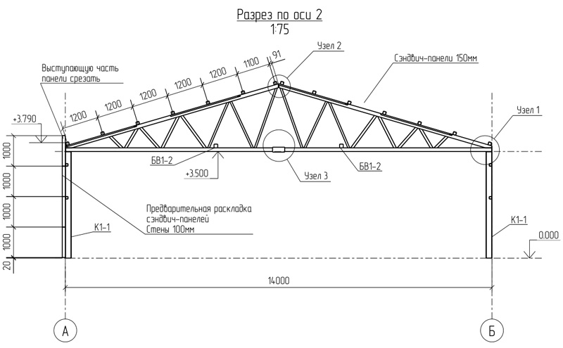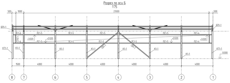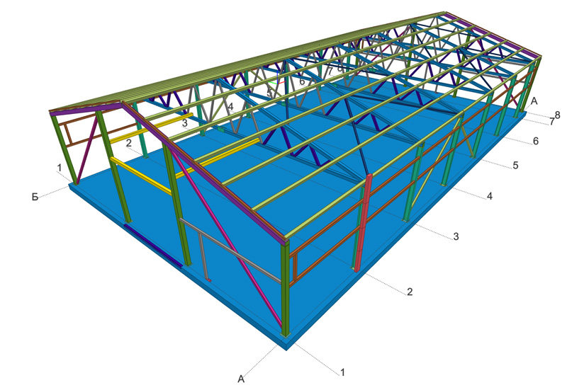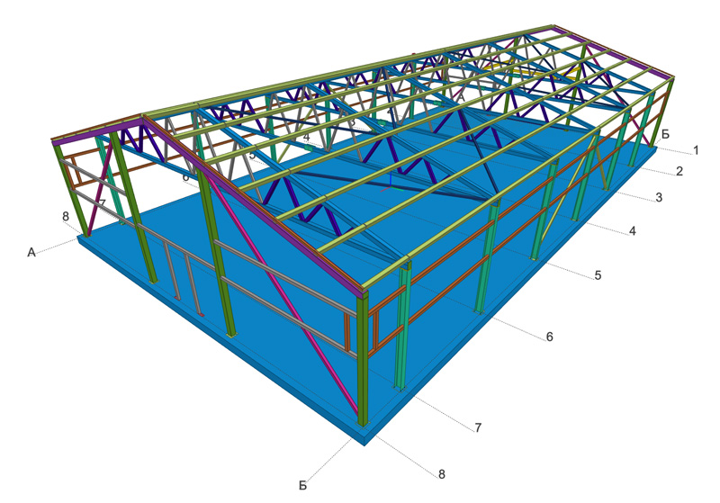 Общая площадь - 357 м2 Металлоемкость каркаса – 11902 кг, 33,34 кг/м2. Кровля и стены - сэндвич-панелей. Фундамент - плита